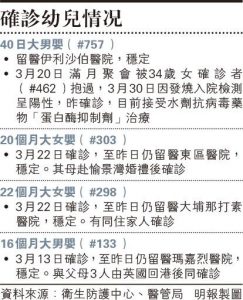 染疫者曾抱 40日大嬰兒確診 一名40日大嬰兒昨日確診,成為本港最小確診者。男嬰在滿月聚會時被一名確診者抱過,其後因發燒入院,目前要接受抗病毒藥治療。有藥劑師稱有關藥物有2%至10%現肝酵素上升風險,亦可影響心率。另有懷孕21周孕婦確診,成本港第二宗孕婦個案。衛生防護中心傳染病處主任張竹君呼籲,對嬰兒、老人及慢性病患者應「少探望、… 詳情